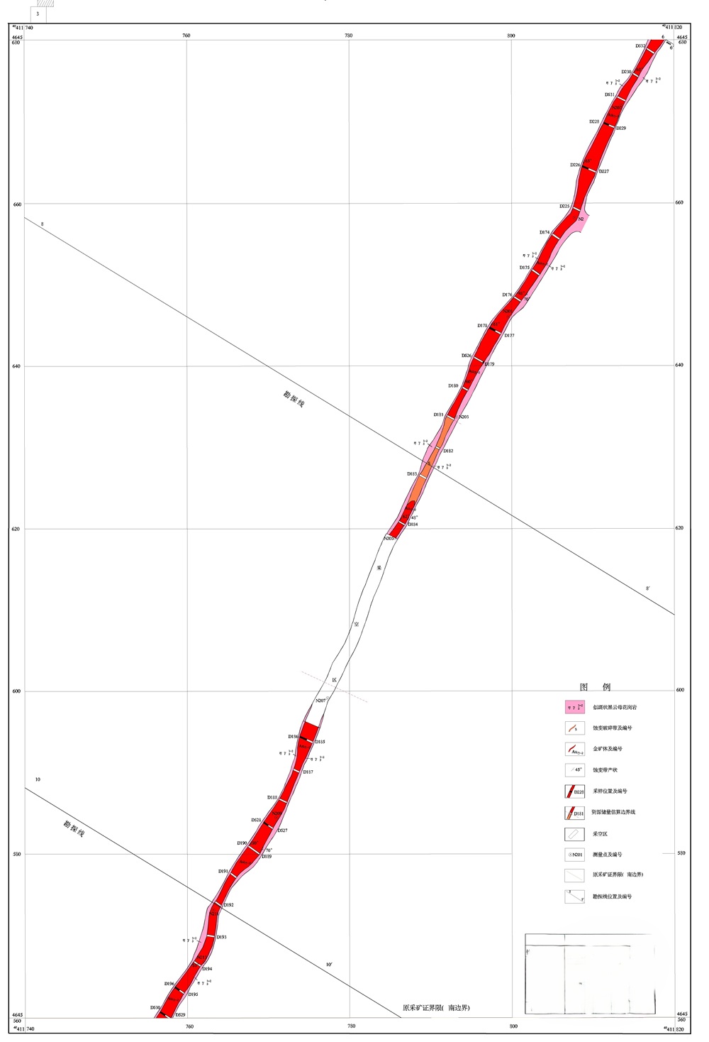 1号矿体(主矿体),位于矿区东南部,地表长 702m,控制最大斜深 123m,真厚度 0.75-2.20m(平均 1.43m,变化系数 29.78%),品位 61.35-78.83%(平均 72.36%,变化系数 9.10%),资源储量占比78%,由 10 条探槽、3 个钻孔控制;